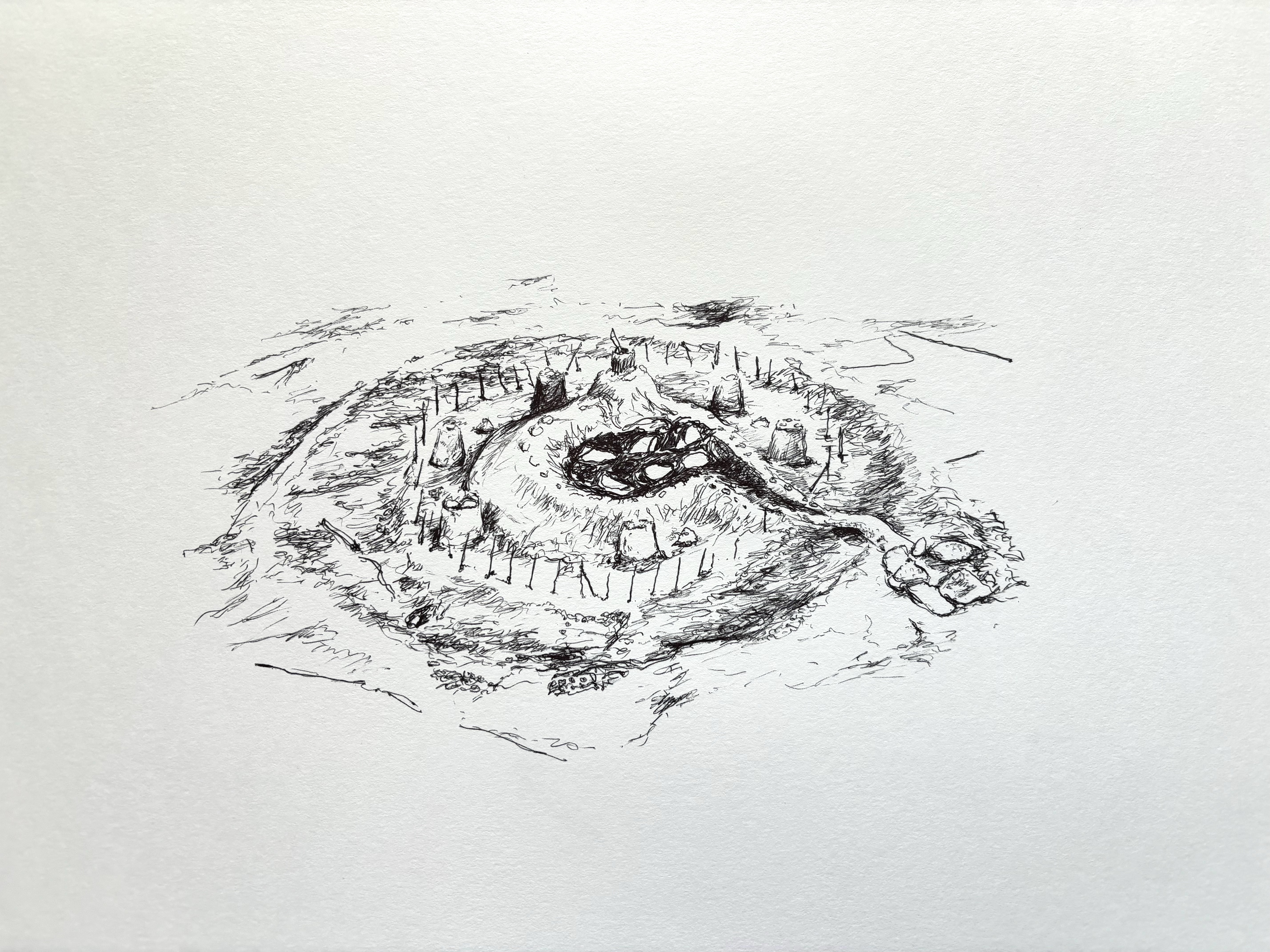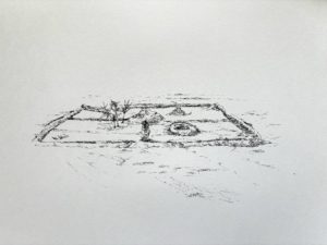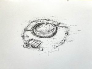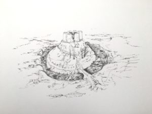 Loin de s’arrêter à l’évocation ludique et désuette des formes récréatives et paysagères du jeu de plage ou de l’évocation d’une enfance en devenir, ces petites fabriques éphémères convoquent les forteresses imaginaires. Les tunnels, donjons, tours, remparts, douves, fenêtres et jardins, tumulus, réserves, jeux et accessoires de toutes sortes composent un florilège de données graphiques et une écriture plastique que l’on peut interpréter comme une carte primitive qui code et scénarise le récit animé de sa propre destruction à venir.
