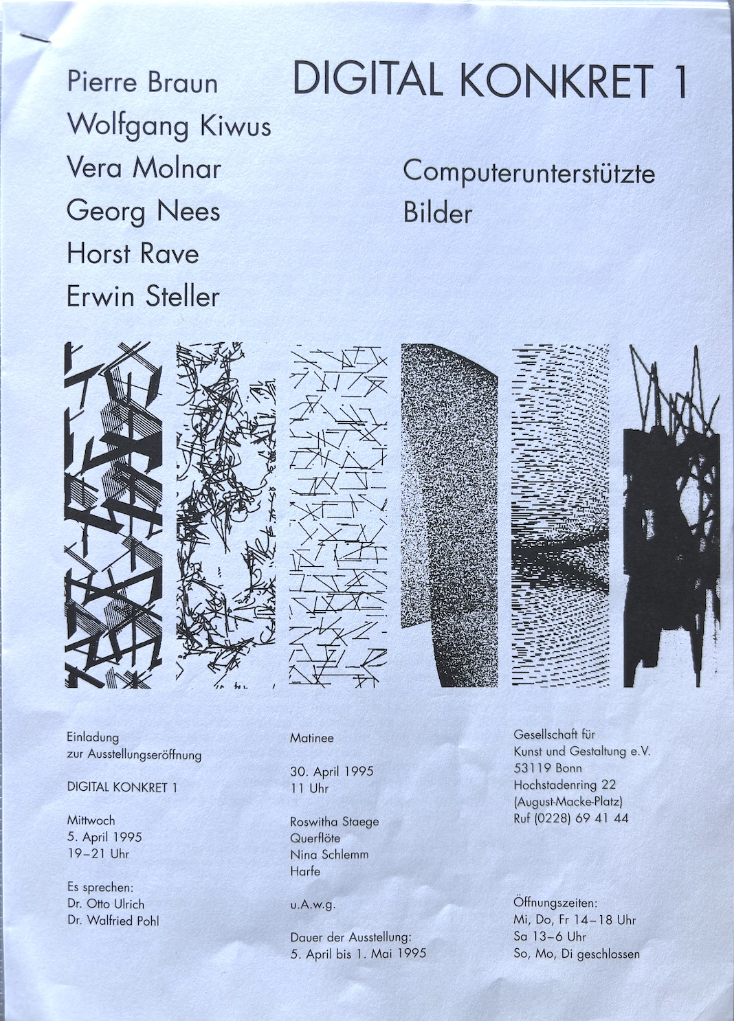 Digital Konkret 1, exposition avec Wolfgang Kiwus,Véra Molnar, Georg Nees, Horst Rave et Erwin Steller, Gesellschaft für Kunst und Gestaltung, Bonn/D.