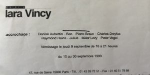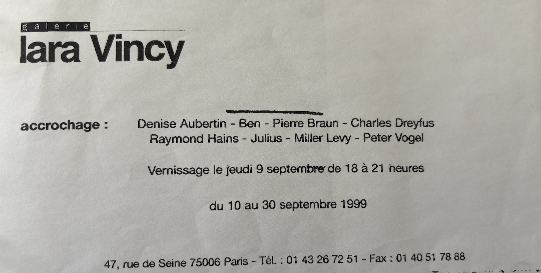 Denise A. Aubertin, Ben, Pierre Braun, Raymond Hains, Rolf Julius et Peter Vogel, galerie Lara Vincy, Paris.